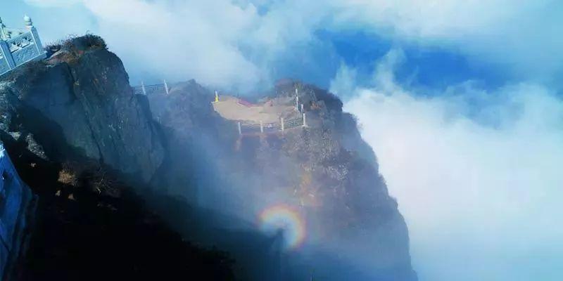 在金顶舍身岩上弯腰向下看,会看到一个五彩的光环漂浮在云层中,自己的身影也在光环之内。