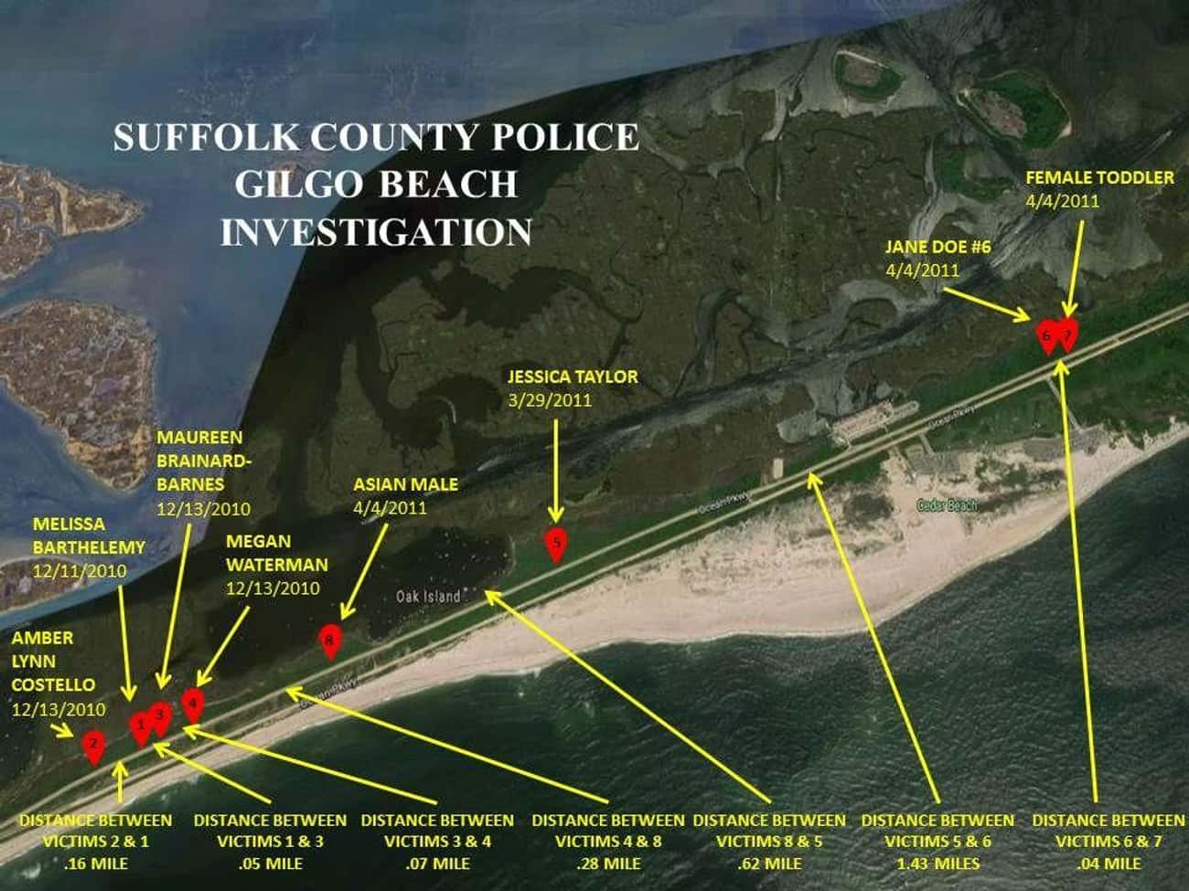 七个月后,警方在搜寻吉尔伯特时,发现四具尸体,但没有一具是她的。分别是莫林·布雷纳德-巴恩斯,梅根·沃特曼,安布尔·科斯特洛和梅丽莎·巴泰勒米,她们都在2007年到2010年间失踪。和吉尔伯特一样,她们也都是20多岁,在去世前都是伴游女郎。而且当局发现她们尸体的地方——吉尔戈海滩,长期以来一直被用作埋尸点,最终在这里发现了另外六具尸体。最终调查人员认为,这四名女性都是连环杀手的受害者。