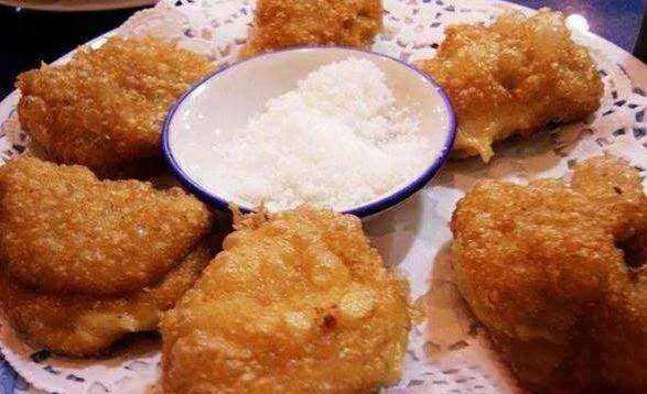 这是呼和浩特一道传承千年的传统糕点名吃。黄米炸糕是将黄米加工成粉状后蒸熟,趁热揉搓光滑,揉出弹性,包上豆沙馅,胡麻油烧到七成热后炸成金黄色捞出食用。一盘迷人的黄米炸糕,表面一定要有一层均匀的金黄油泡,金灿灿油润润,外表酥脆,内里软黏,豆馅甜香,欲罢不能。不包馅的炸素糕,酥软醇香,蘸食白糖亦别有风味。
