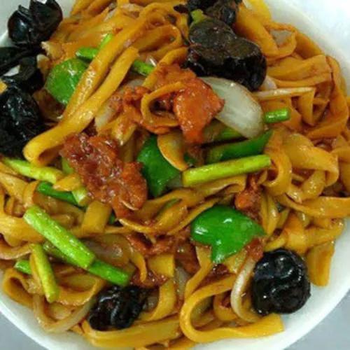源自山西的过油肉炒刀削面,随着走西口流传到呼市,经过多年的传承和发展,成为一道具有呼市特色的传统面食。回勺面是将刀削面煮熟,用过油肉、木耳、豆芽、蒜苔、洋葱炒熟,用盘盛装,色彩丰富,面条爽滑筋道,过油肉外软里嫩,浓香油润,亦菜亦饭。如今,回勺面已经成为呼和浩特回味过去滋味的传统老味道。