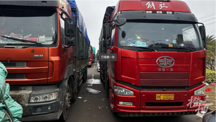 排我前面那个师傅,他是从广州过来的,昨天下午3点到的这个海安新港前面等待排队,到今天已经大概22个小时了,只往前走了2公里。排我后面是来自贵州的一位大姐,她是昨天晚上12点多到这里的,排进来之后十几个小时了,也只往前移了1公里多。”