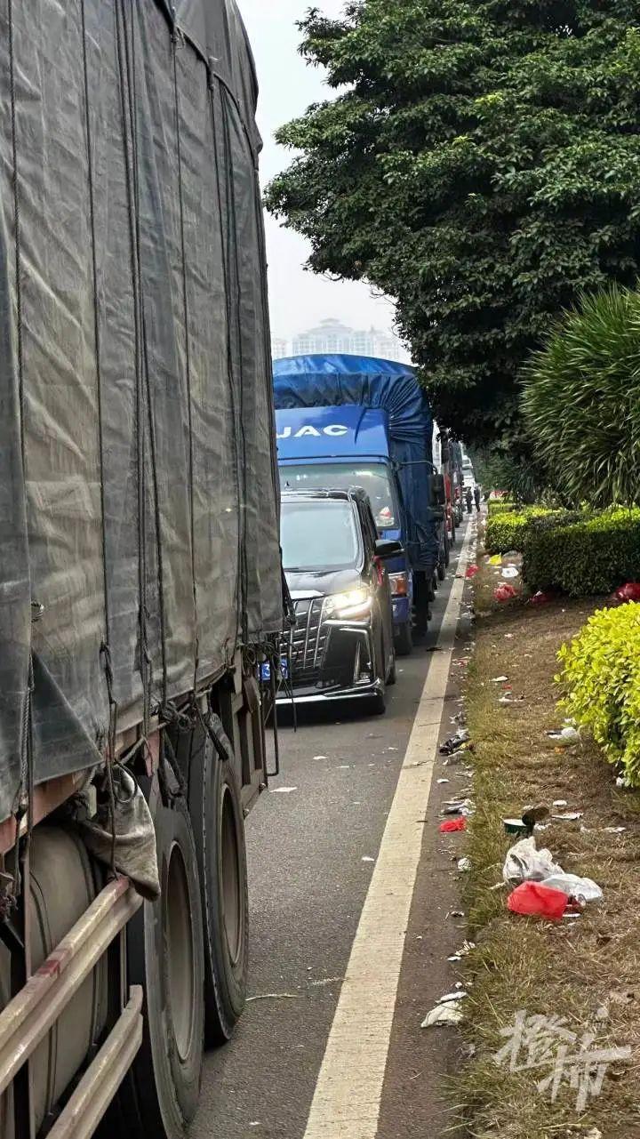路两旁都是垃圾,大货车不少都等了两三天