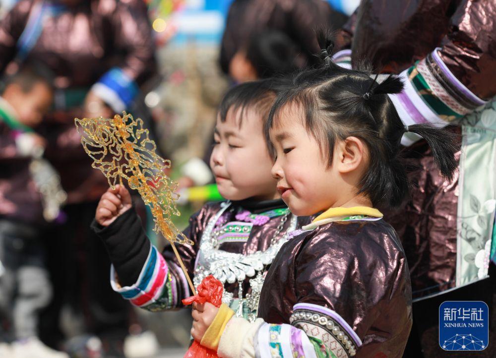 1月24日,在贵州省黔东南苗族侗族自治州从江县刚边壮族乡银平村,两名小女孩在品尝糖画。新华社发(罗京来摄)