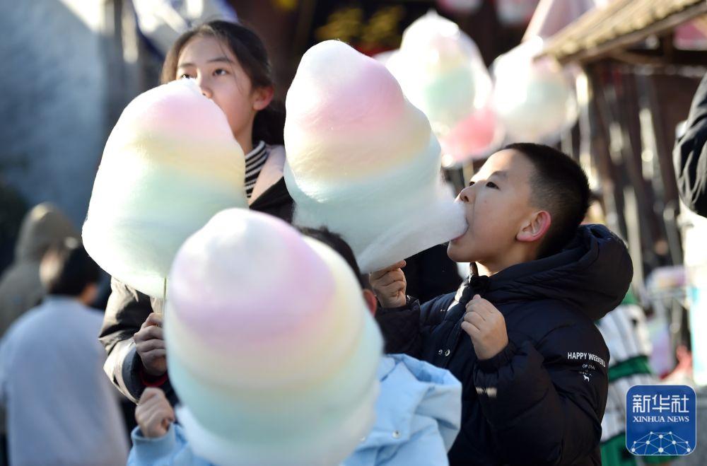 1月24日,在河北省石家庄市鹿泉区土门关驿道小镇,小朋友品尝棉花糖。