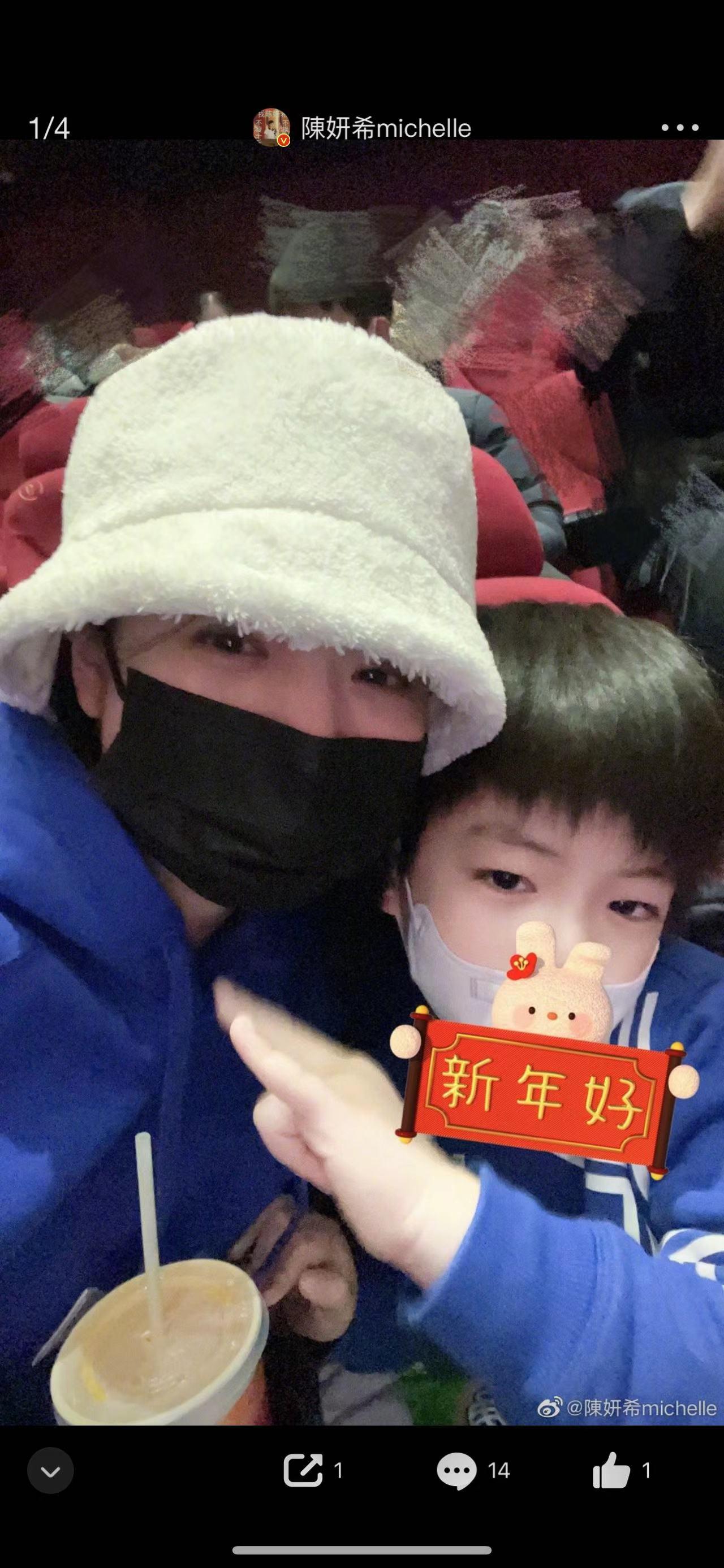 1月26日陈妍希晒出带着儿子小星星一起观看电影的合照,她在配文中写道:今日是第一次带陈星星去电影院看电影,选择的影片是《流浪地球2》,觉得特别有意义。