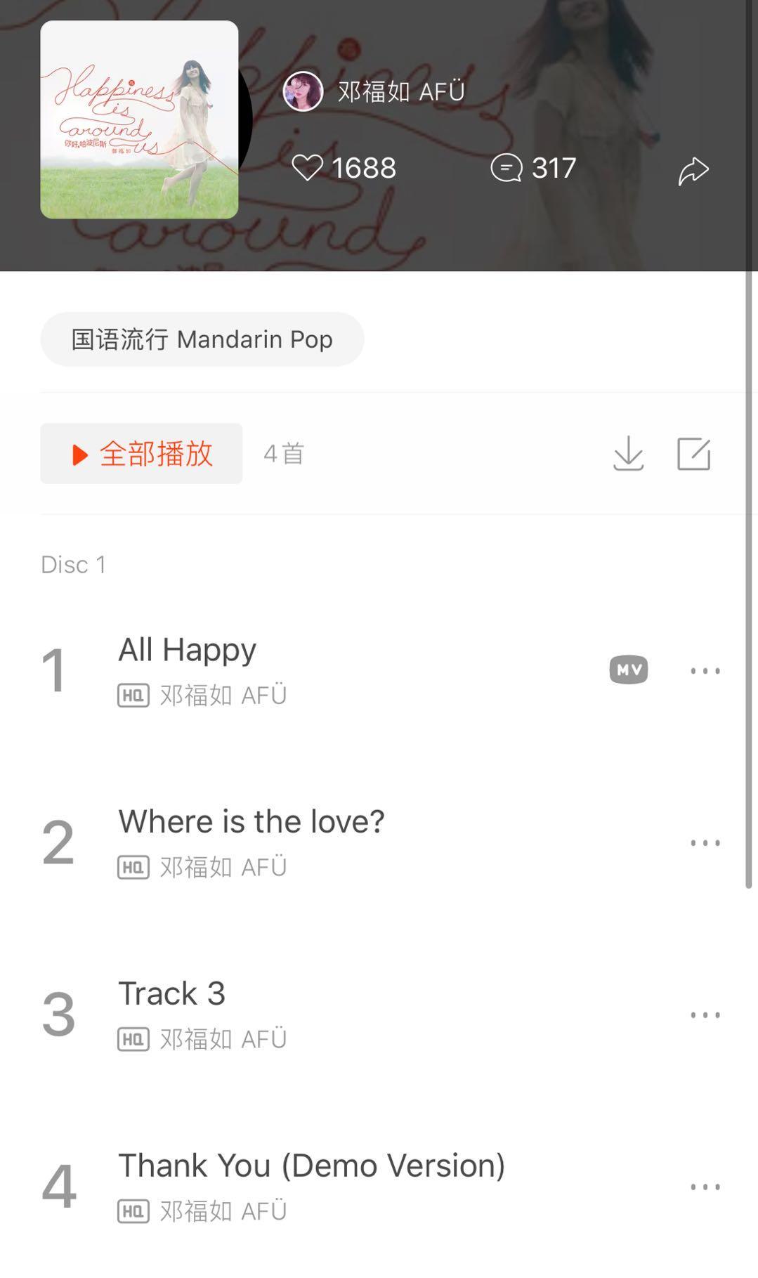 虽然小编想把每一首都发出来...因为每一首都是经典啊!!!尤其专辑中的《一点点喜欢》和《如果有如果》也被选中作为影视剧片尾曲。邓福如随后在新加坡举行的“原来如此音乐会”,获音乐制作人李伟菘现身到台上表示支持。在香港歌唱比赛《超级巨声3》与参赛者合唱作品《如果有如果》,获评审陈洁灵赞赏“很有福气可以听到阿福唱歌”, 而另一评审在他的音乐专栏表示,受邓福如的歌声和她创作的《如果有如果》打动。填词人曾纪诺也认为邓福如拥有令人赞叹的歌声,及近乎完美的和唱技巧。